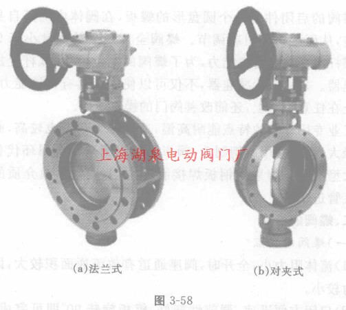 蝶阀主要由阀体、蝶板、阀杆、密封圈和传动装置组成。蝶阀有A型和LT型,如图3—57中(a)和(b)。启动传动装置,阀瓣在阀体内转动,连通或截断阀体通道,达到蝶阀的开关。
