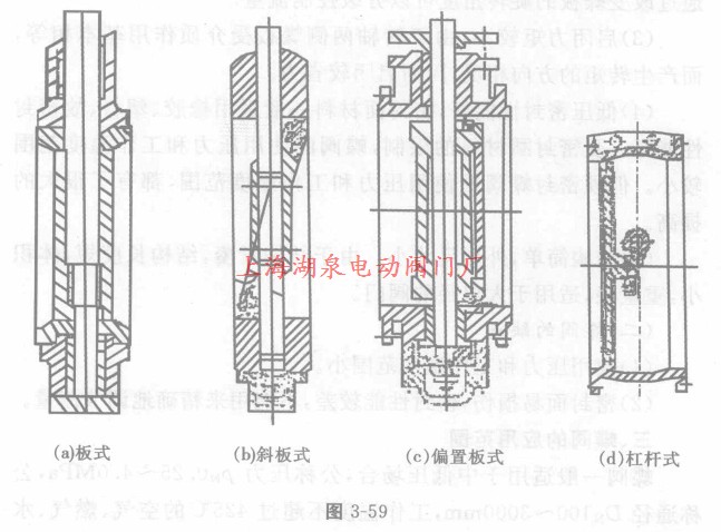 蝶阀根据连接方式分为:法兰式、对夹式,如图3—58(a)和(b)所示;根据密封面材料分为:软密封、硬密封;根据蝶板在阀体中的安装方式,蝶阀可分成:板式、斜板式、偏置板式、杠杆式。如图3-59所示。