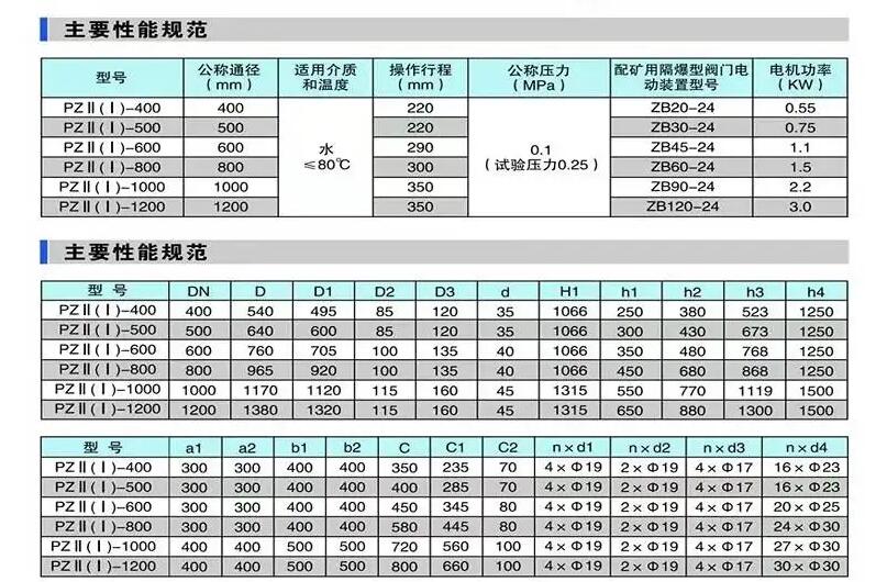 手动配水闸阀是在原PZ1型的基础上进行了改良设计;PZII型是在改良设计的基础上增加矿用阀门电动装置,来满足煤矿水泵房无人值班,全自动化生产的需求。具有结构简单、密封性能好、清污方便、操作灵活、省力等特点,主要应用于井下泵房吸水井的配水之用。配水闸阀也可称为配水闸门,是的启闭件是闸板,闸板的运动方向与流体方向相垂直,闸阀只能作全开和全关 , 不能作调节和节流。闸板有两个密封面 , 常用的模式闸板阀的两个密封面形成楔形、楔形角随阀门参数而异 , 通常为 50, 介质温度不高时为 。楔式闸阀的闸板可以做成一个整 体,叫做刚性闸板;也可以做成能产生微量变形的闸板 , 以改善其工艺性 , 弥补密封面角度在加工过程中产生的偏差 , 这种闸板叫做弹性闸板。